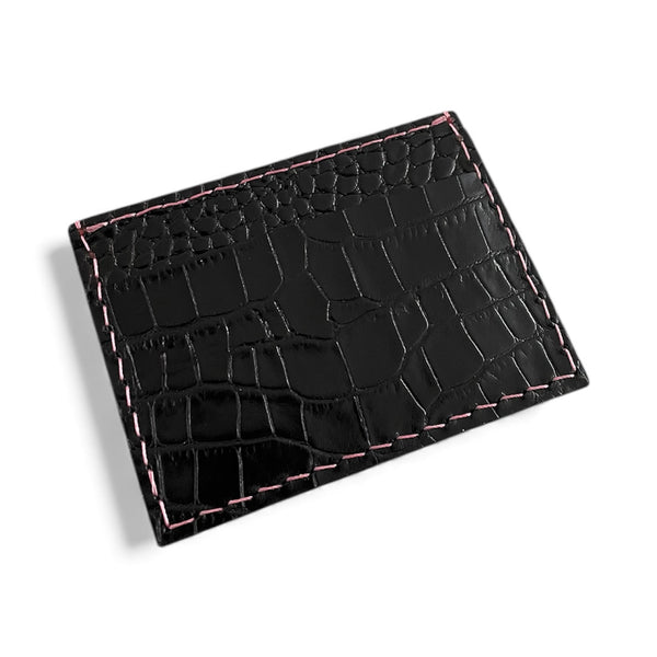 Handmade from 100% full grain embossed crocodile hide, this luxurious, sleek black lined card wallet w/ a light pink polyester thread screams punk rock & bouje in the same breath. Elegant w/ a bold story to tell, this accessory is the perfect conversation piece whether you’re purchasing a coffee at the local cafe, or closing out the tab on a fancy night out!