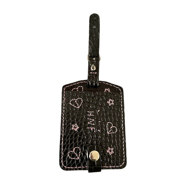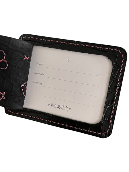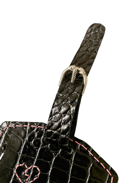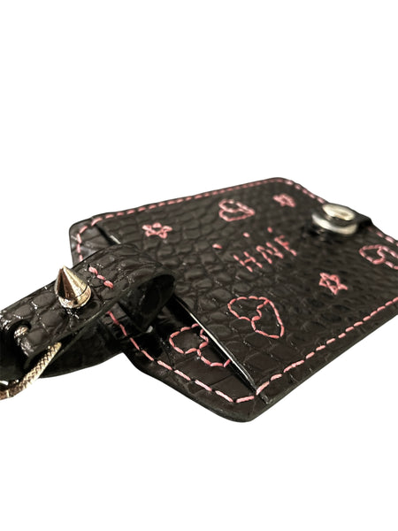 Handmade from 100% full grain embossed crocodile hide; this flashy, rebelliously bold luggage tag w/ a light pink polyester thread and silver lid spikes screams punk rock & bouje in the same breath. Elegant w/ a bold story to tell, this accessory is the perfect conversation piece when checking in your luggage for a flight, or simply showing off your new carry on bag. Be one of a kind and stand out. Trust, it’s easier to find your shit that way.