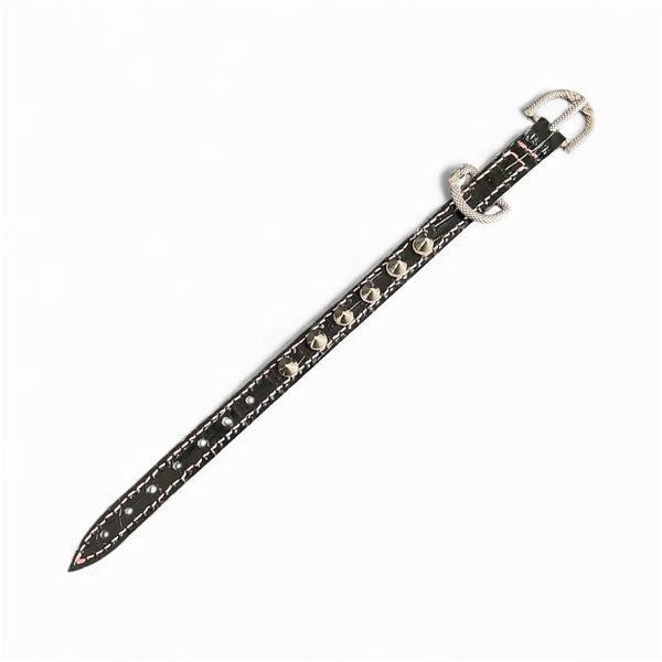 Handmade from 100% full grain embossed crocodile hide; this flashy, rebelliously bold pet collar w/ a light pink polyester thread and silver lid spikes screams punk rock & bouje in the same breath. Elegant w/ a bold story to tell, this collar is the perfect conversation piece when showing off your fur baby at the local coffee shop, taking a stroll for some fresh air, or a nice lil visit to the vet.